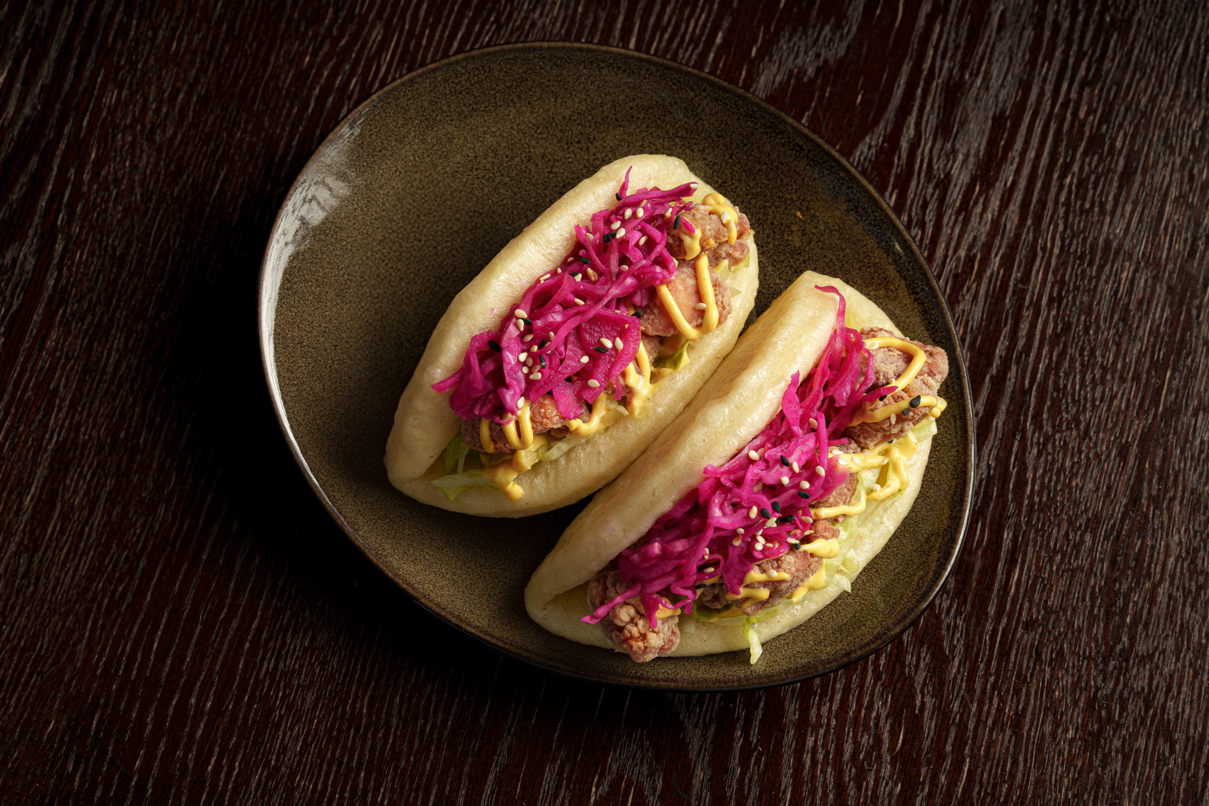 Домашние булочки бао, курица карааге, маринованная красная капуста, айсберг, соус шрирача айоли.